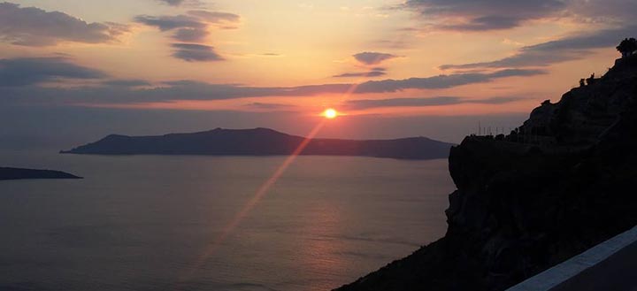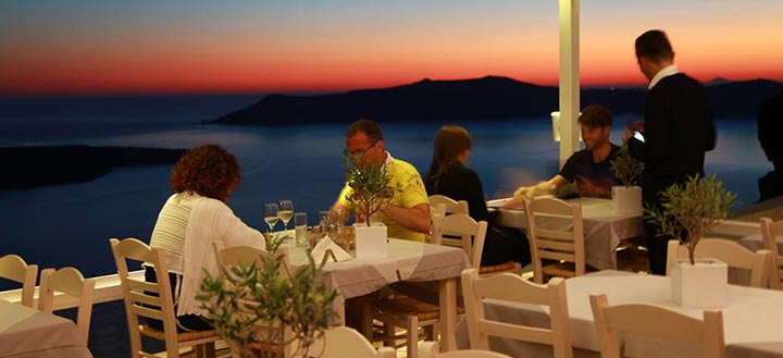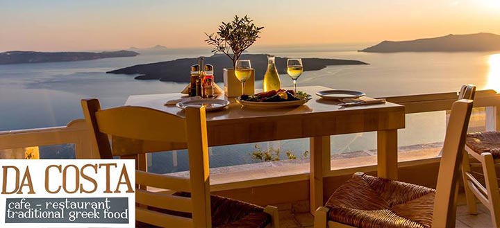 The Da Costa restaurant located in the heart of Santorini, Fira. Our restaurant is located right on on the side of the caldera of Santorini next to our famous cable car, where the view includes a panoramic look of Santorini volcano and the most beautiful sunset in the world right right before your eyes.