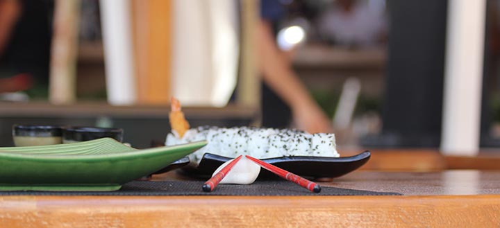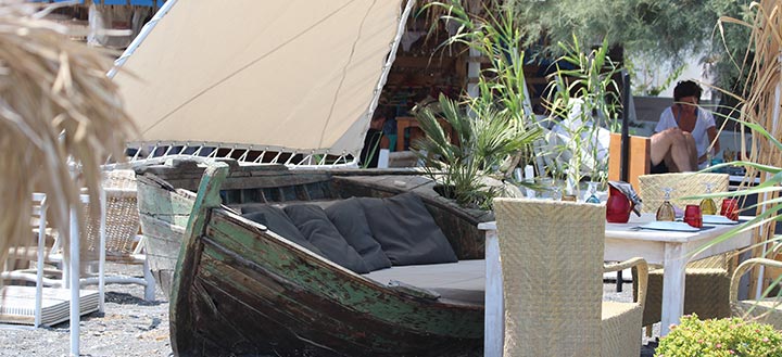Πιο πάνω, ο χώρος του εστιατορίου και του μπαρ. Παλ χρωματισμοί, χτιστοί καναπέδες, και πλεκτές αναπαυτικές καρέκλες και μουσικές του κόσμου συνθέτουν ένα σκηνικό καλοκαιρινής χαλάρωσης, ενώ η δημιουργική κουζίνα του σεφ σας ταξιδεύει σε Δύση και Ανατολή δημιουργώντας γεύσεις μεσογειακές με τις δικές του πινελιές. Μοναδική εμπειρία και το φαγητό στο τραπέζι-βάρκα πάνω στην παραλία συνοδεία έθνικ και lounge ακουσμάτων, που αποκτούν και ρυθμό ανάλογα με την ώρα και το ύφος του κόσμου.